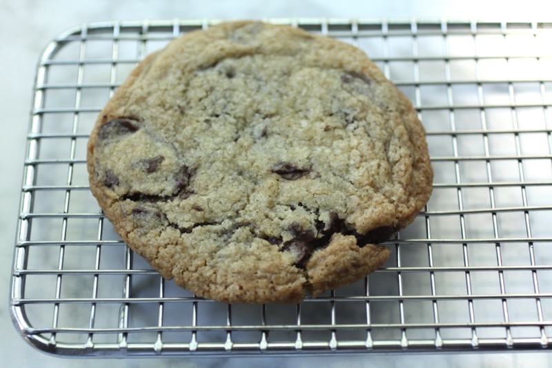 Place a couple of cookies in a sheet pan with plenty of space (between 3 and 4 inches) in between them. Bake for 10 minutes until the cookies are puffed slightly in the center. In a superfast operation, remove the cookie from the oven (shut the door) and bang them onto a steady hard surface. I know this will feel wrong, but don’t worry, it works. Return to the oven. After the cookies puff up again, repeat banging them and returning to the oven a few more times to create ridges around the edge of the cookie.
